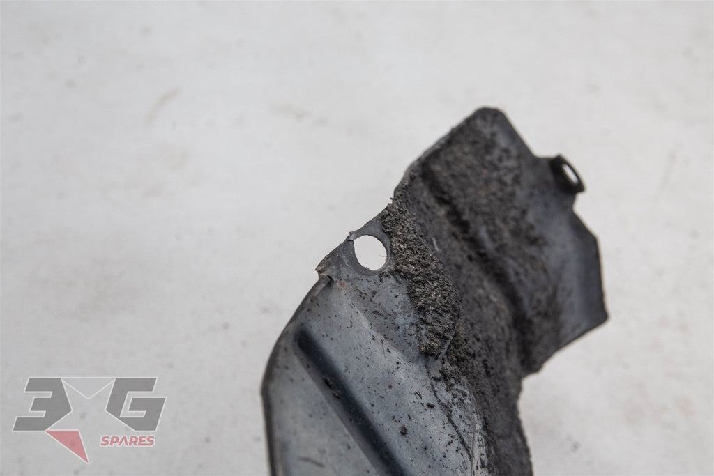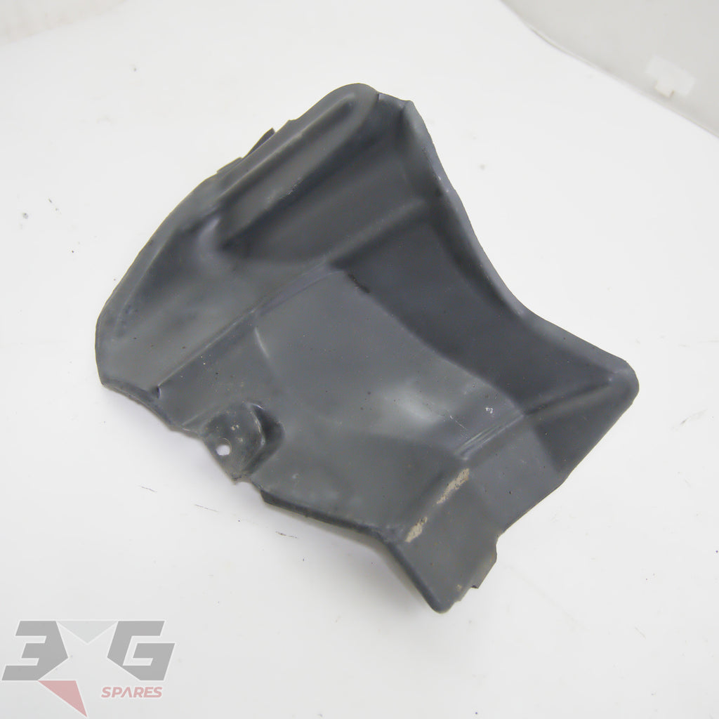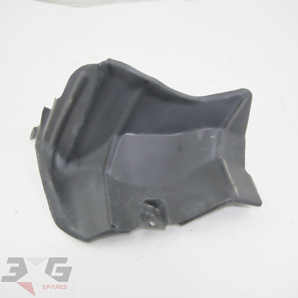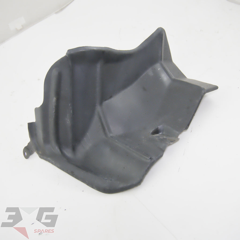 OEM factory splash guard protector which fits over the fuel or gas filler tube in the right rear wheel well, as removed from a R34 chassis Nissan Skyline, years 1998 - 2002.