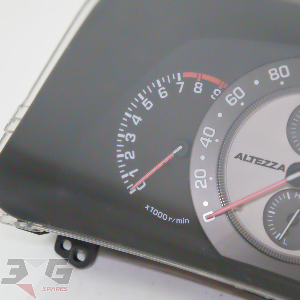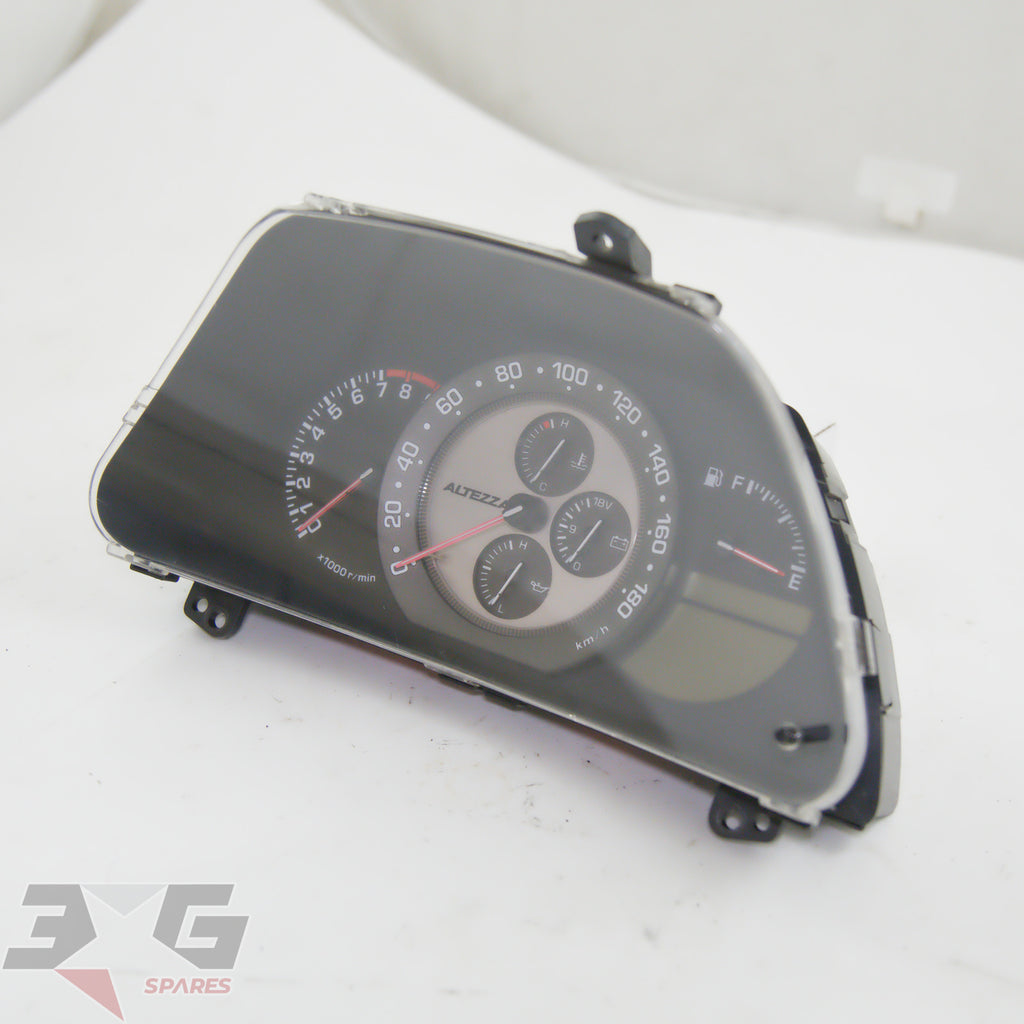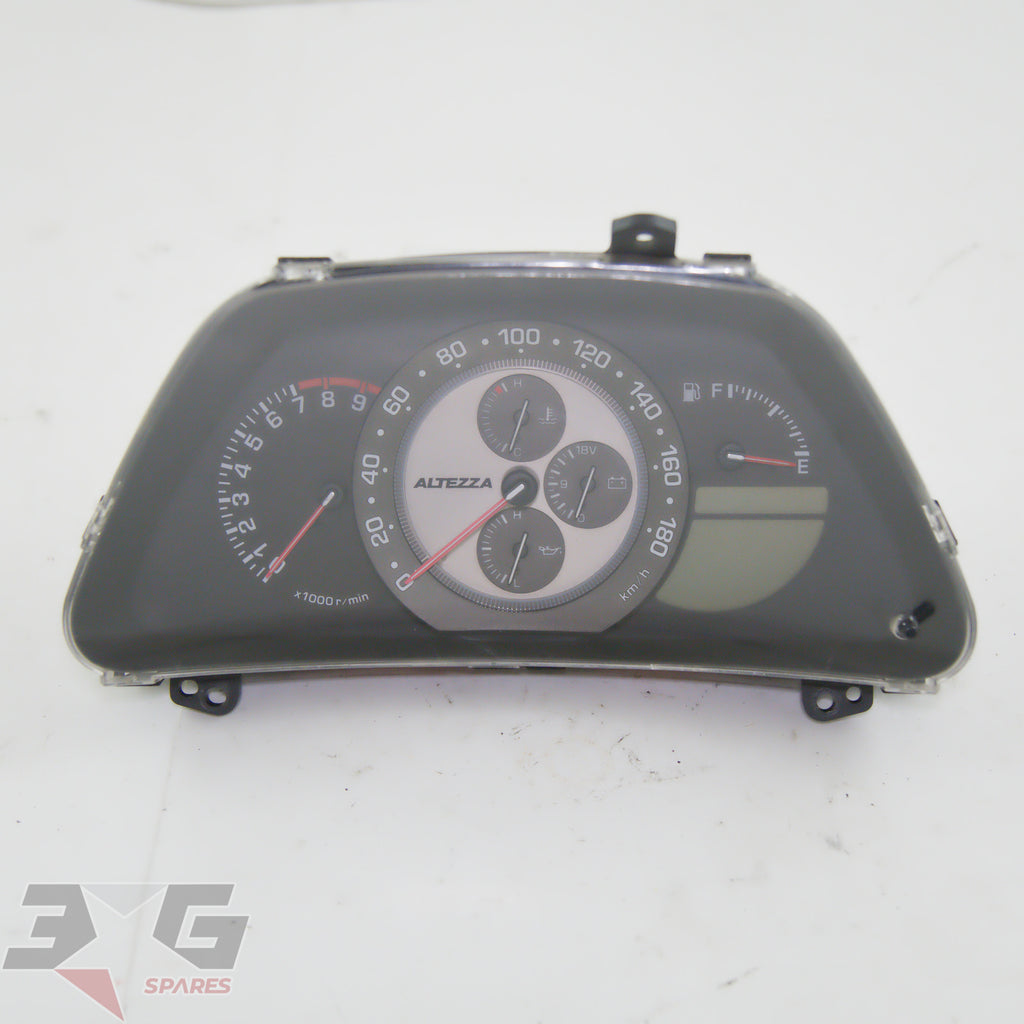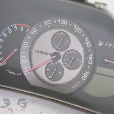 OEM factory gauge cluster, as removed from a Japanese import SXE10 chassis Toyota Altezza with 3S-GE engine, years 1998 - 2005.