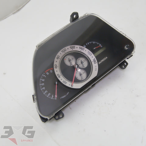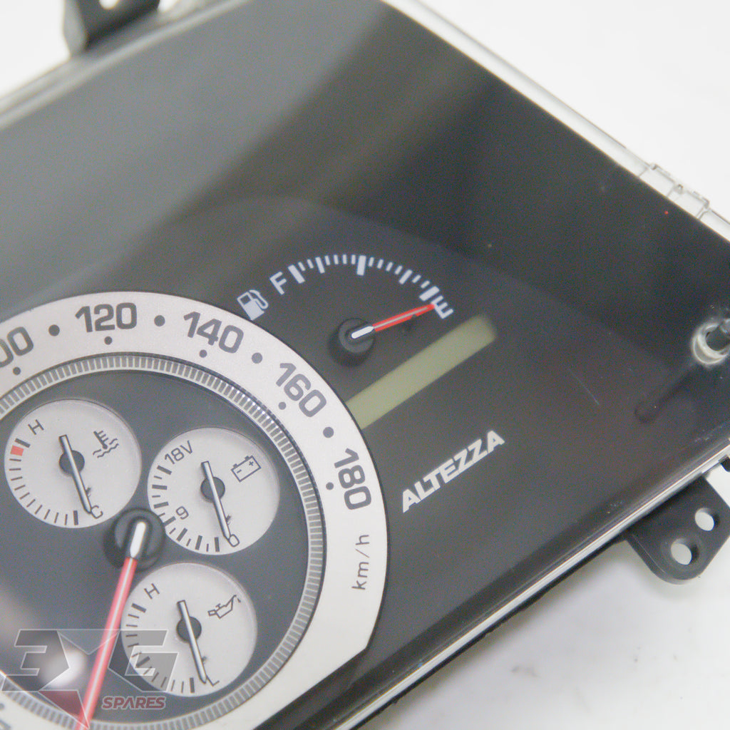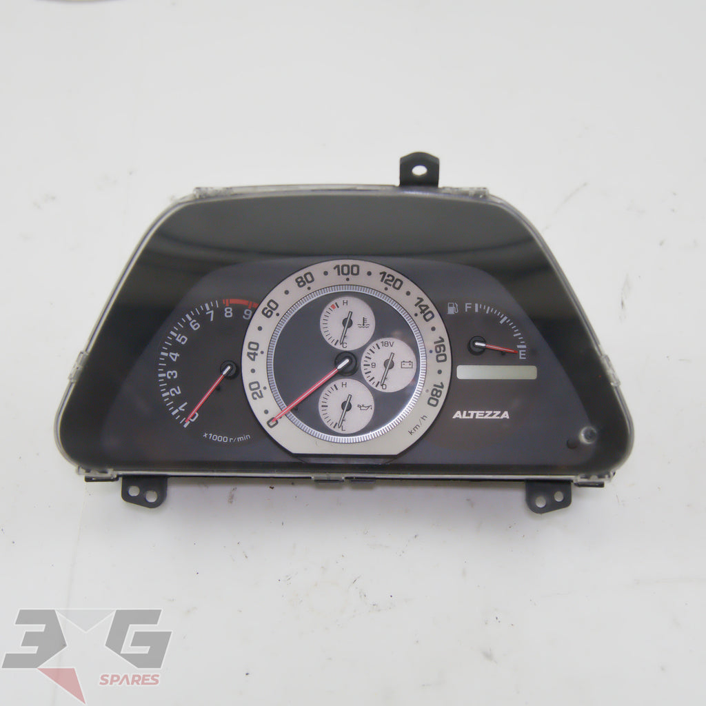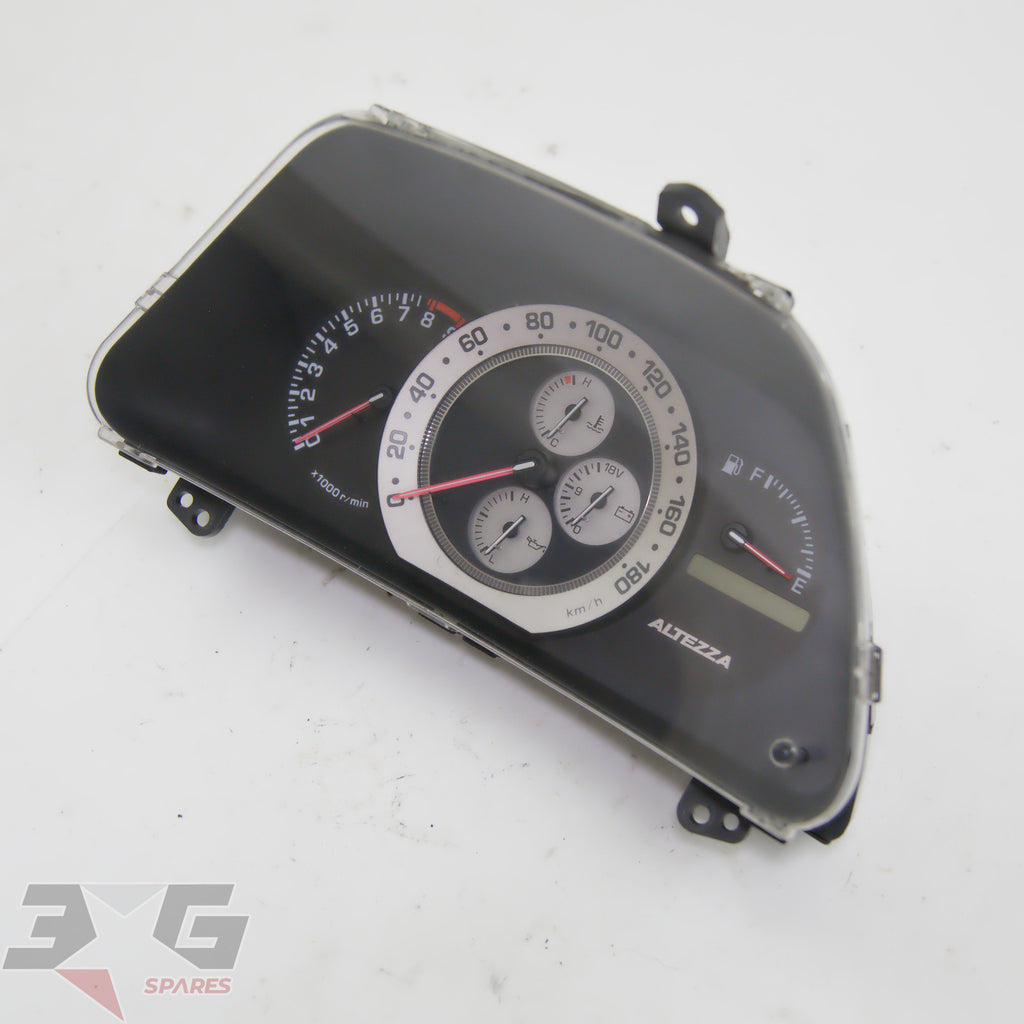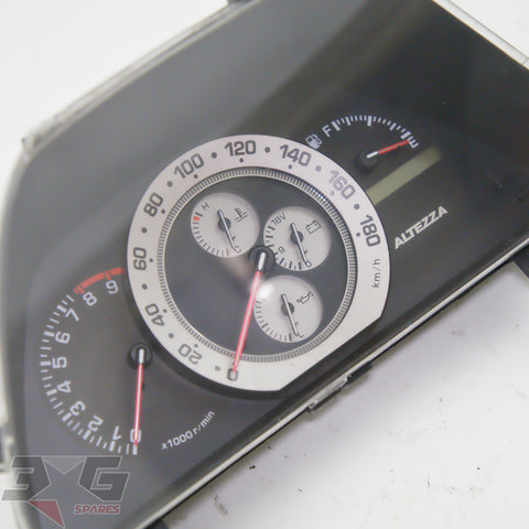 OEM factory gauge cluster, as removed from a right hand drive (RHD) zenki or pre facelift SXE10 chassis Toyota Altezza, years 1998 - 2001.