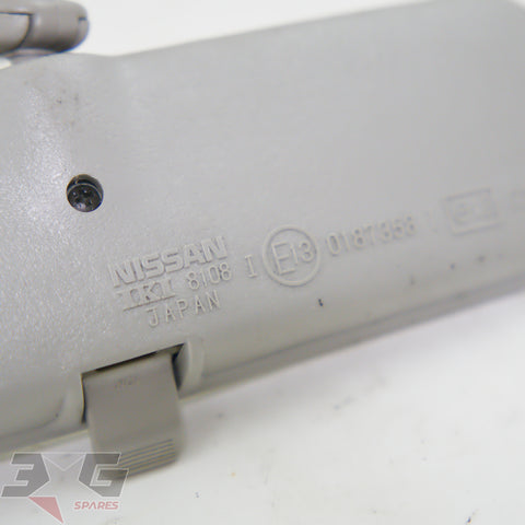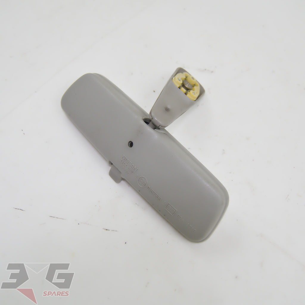OEM factory interior rear vision mirror, as removed from a Series 1 R33 chassis Nissan Skyline, years 1993 - 1995.This physically fits all years of R33 Skyline the only difference is the colour of the plastic.Condition: Good used condition. The mirror backing is tarnished on the edges as shown in the photos.