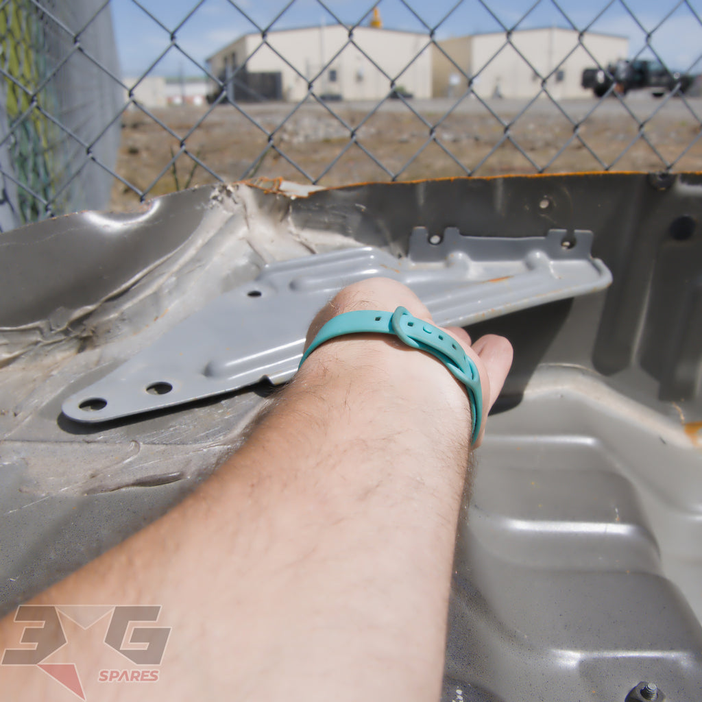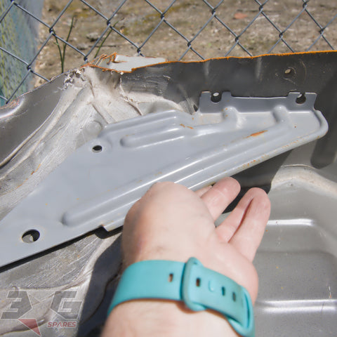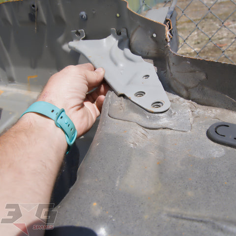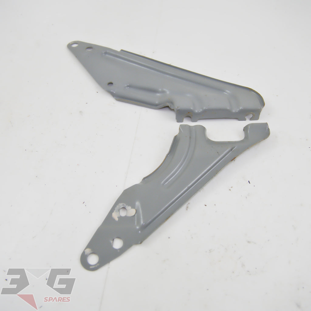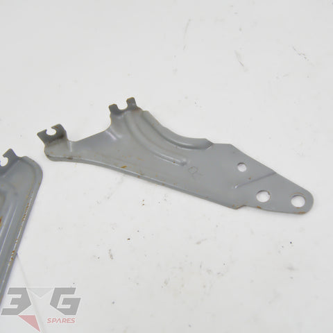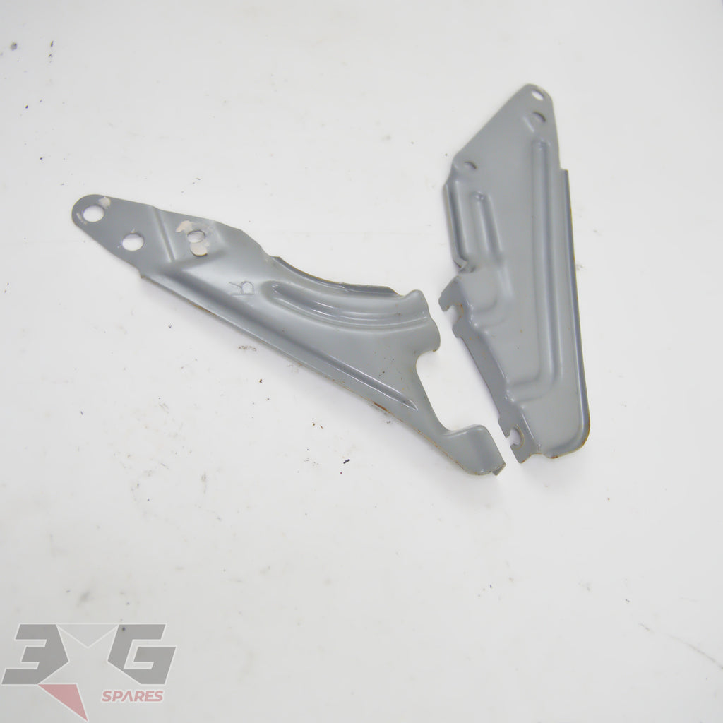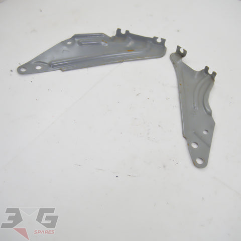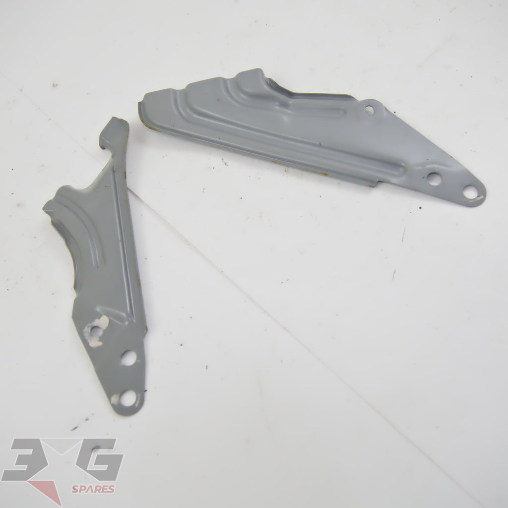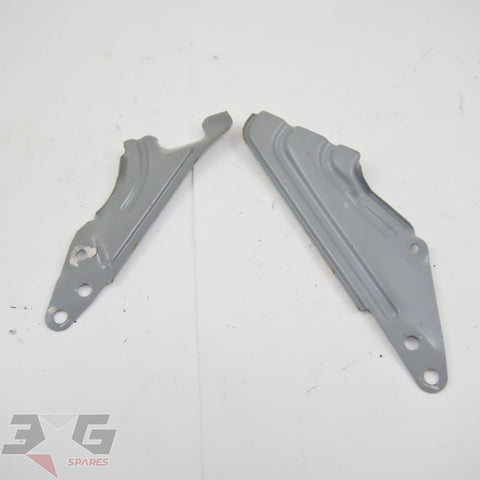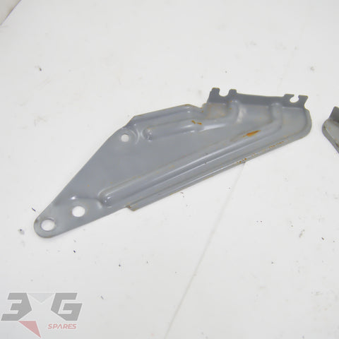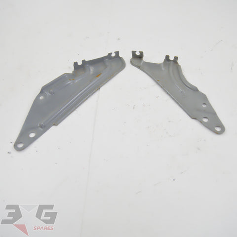 OEM factory left and right side rear boot or trunk floor reinforcement stay brackets, as removed from an R34 chassis Nissan Skyline, years 1998 - 2002.