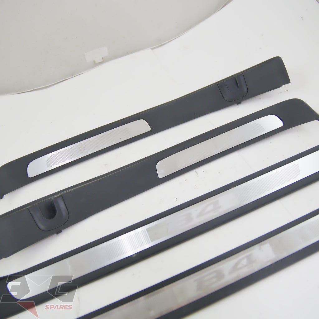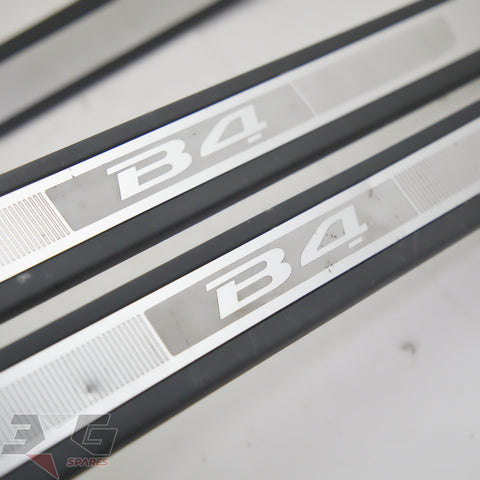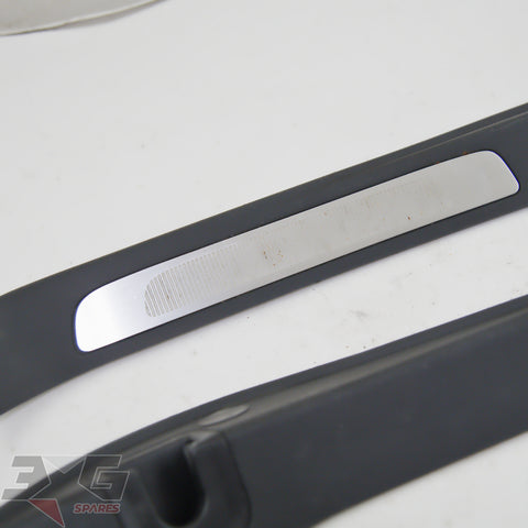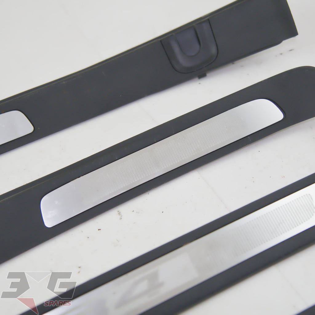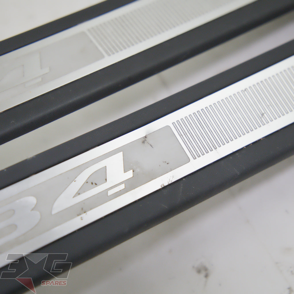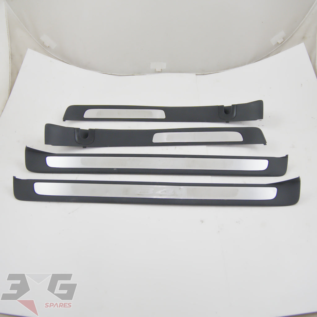 OEM factory full set of factory B4 door sill or scuff plates with the stainless steel insert, as removed from a BL chassis Subaru Legacy, years 2003 - 2008.