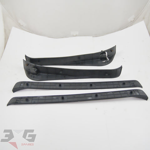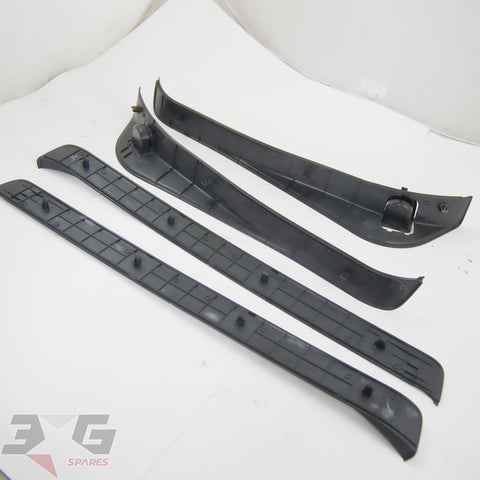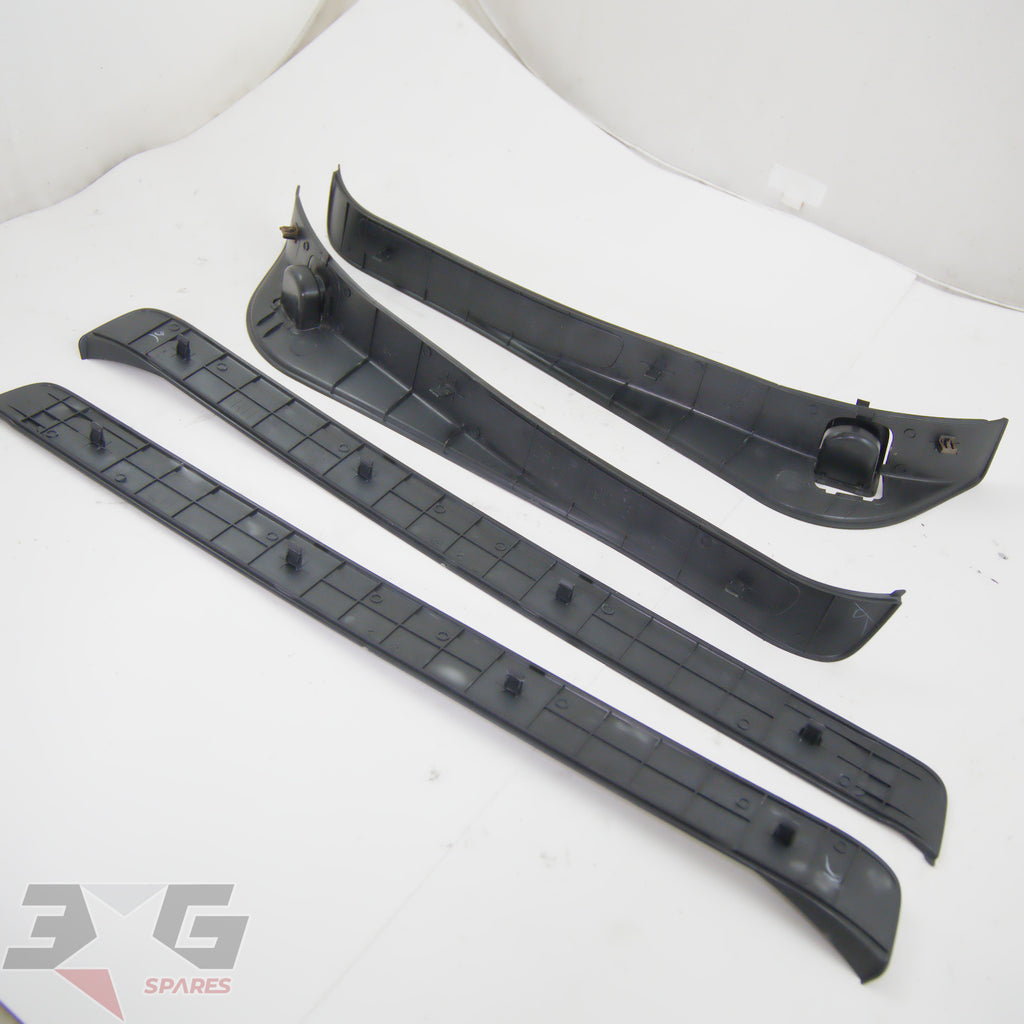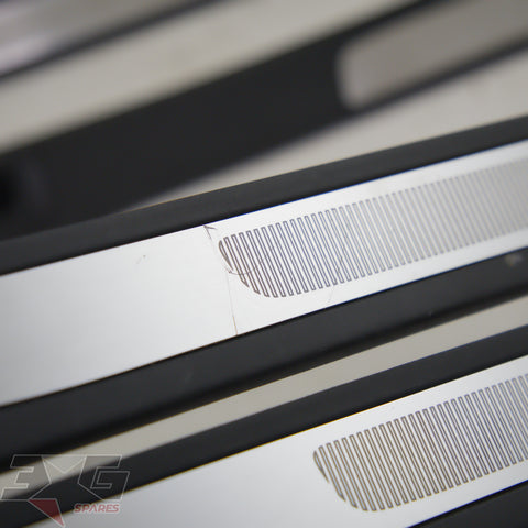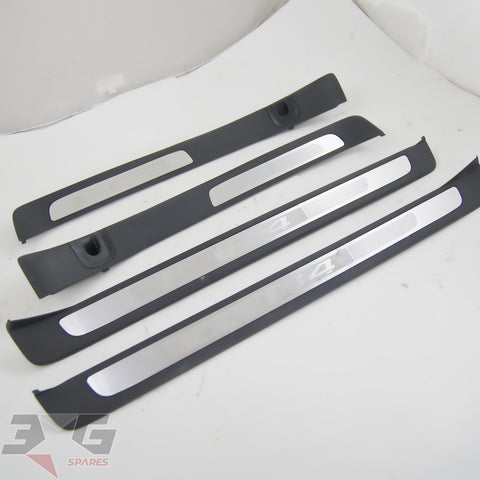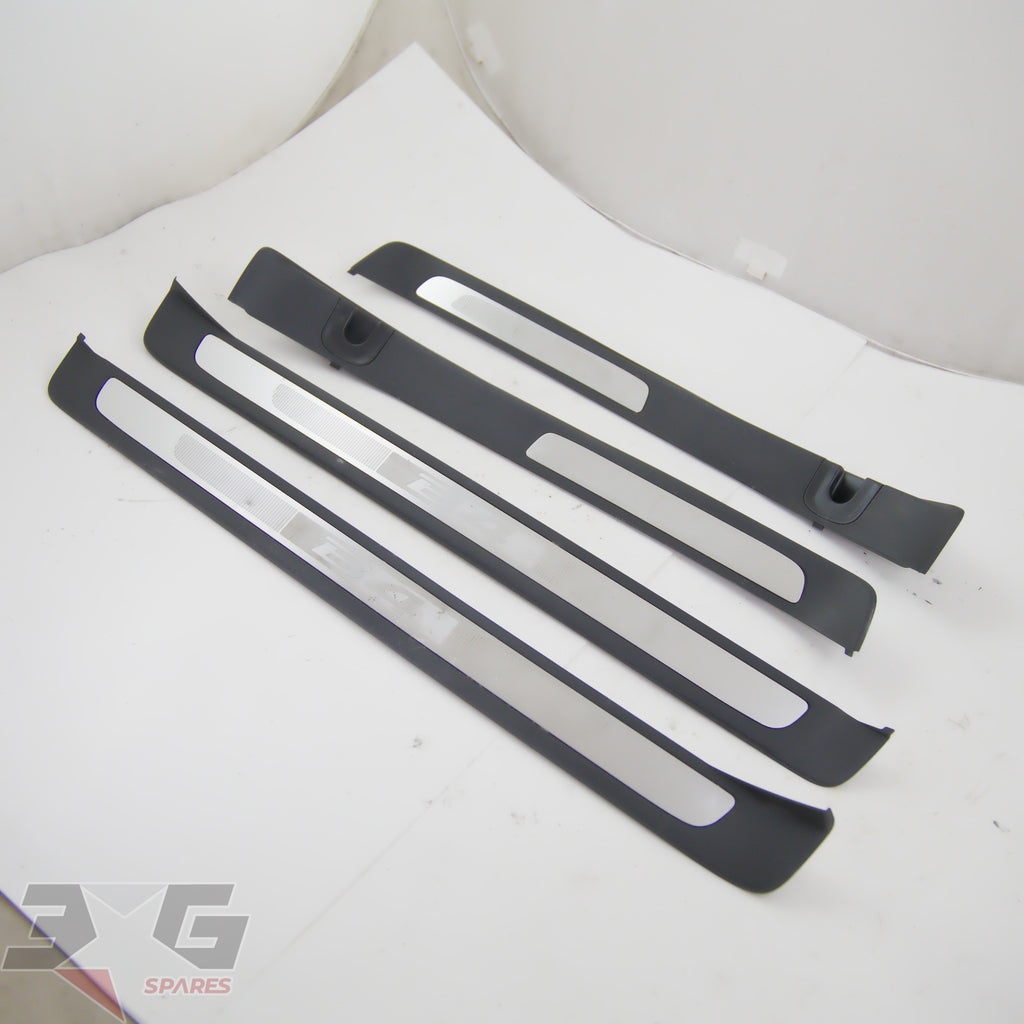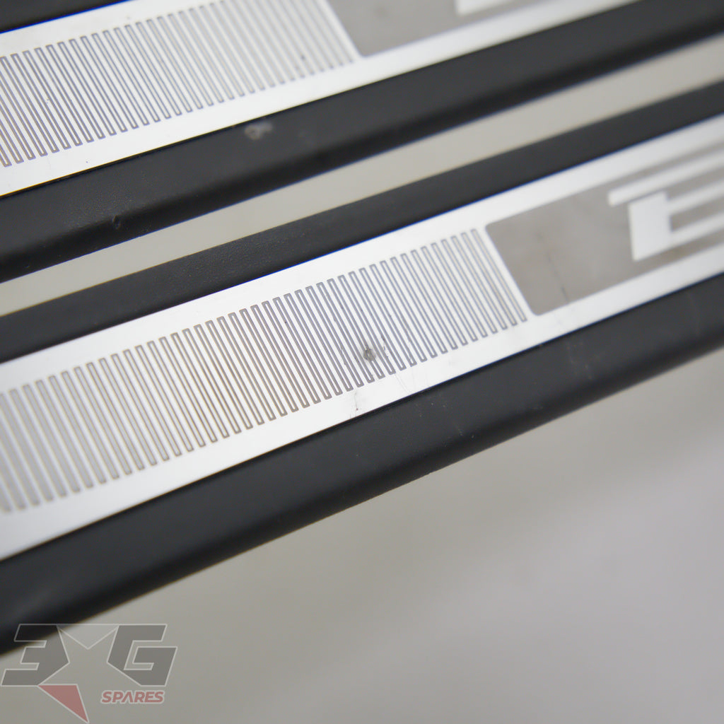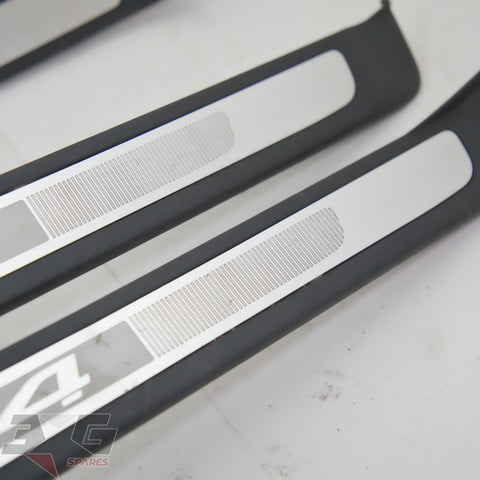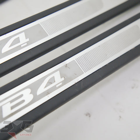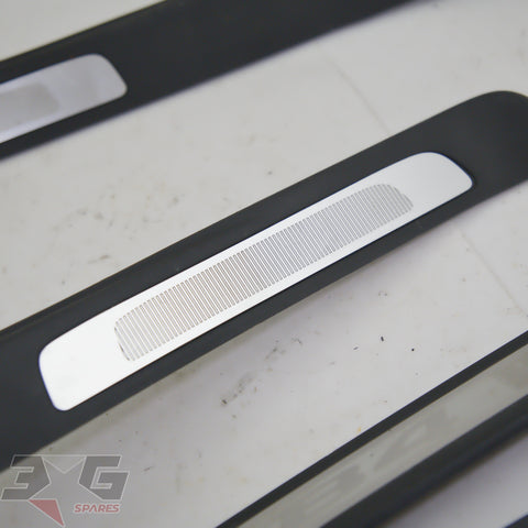 OEM factory full set of factory B4 door sill or scuff plates with the stainless steel insert, as removed from a BL chassis Subaru Legacy, years 2003 - 2008.
