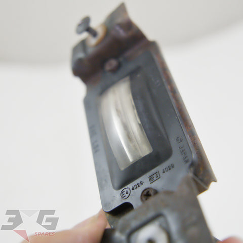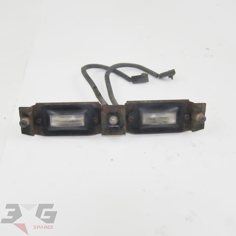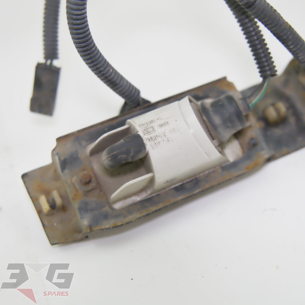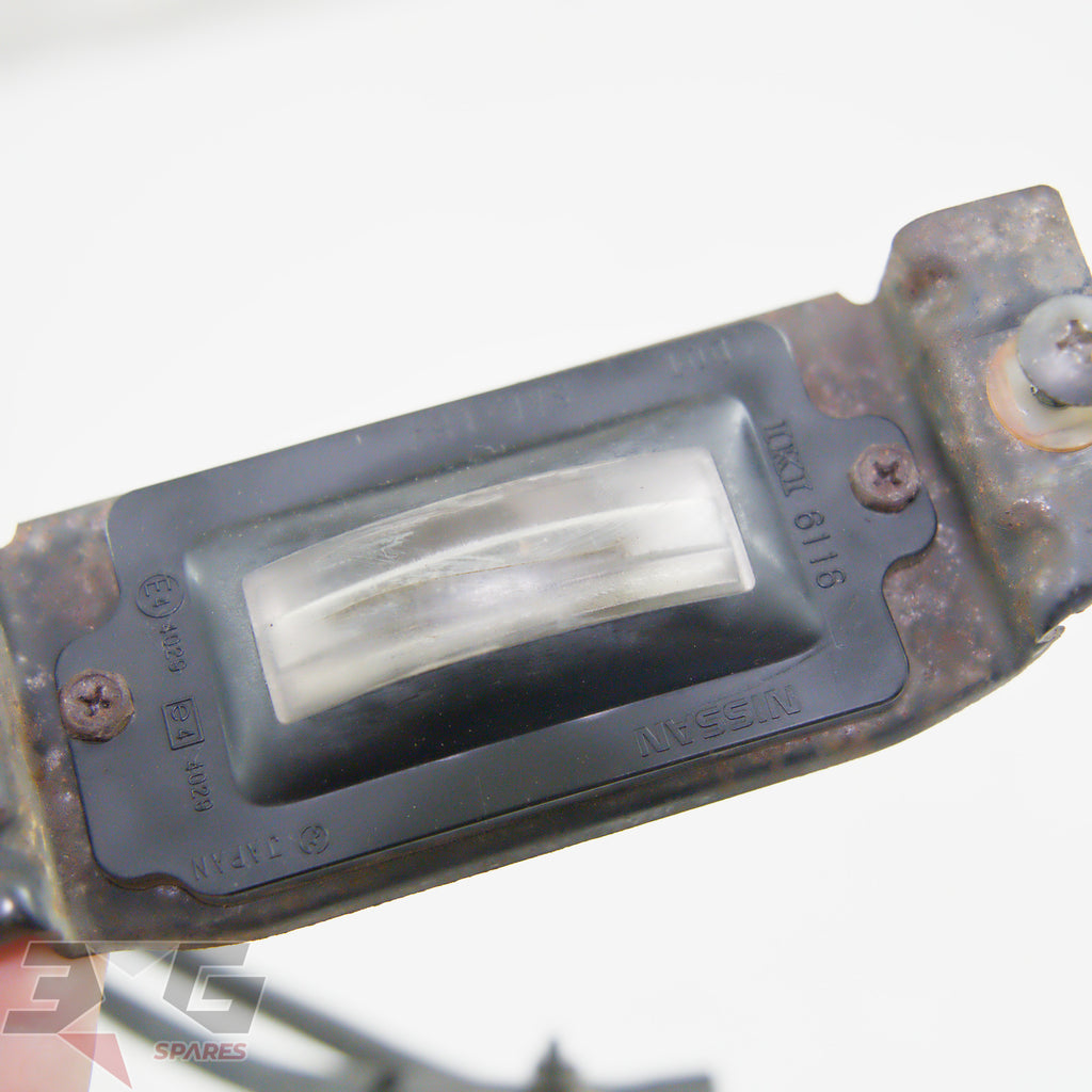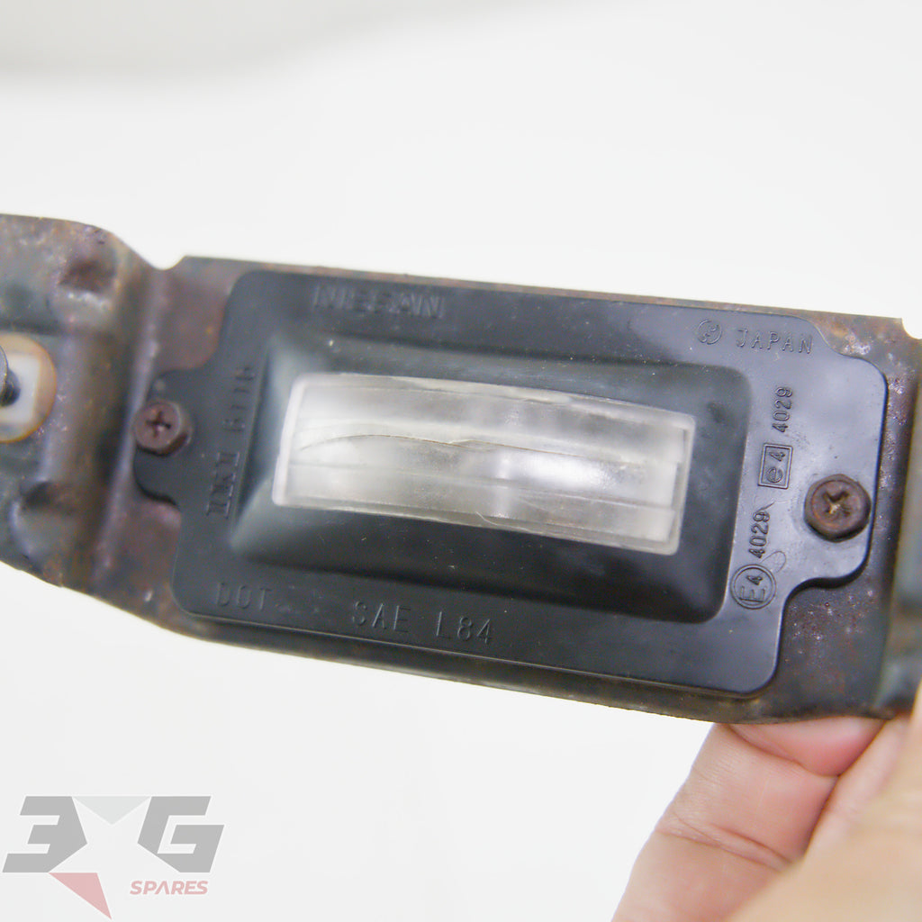 OEM factory rear license plate lights and bracket, as removed from a S13 chassis Nissan 180SX, years 1989 - 1998.This will also fit S13 Nissan Silvia 1988 - 1994. Condition: Good used condition with light rust as pictured. Both light lenses cracks as shown in photos 9 - 12. The photo's are of one of our stock but your item will be the same or better condition than pictured.