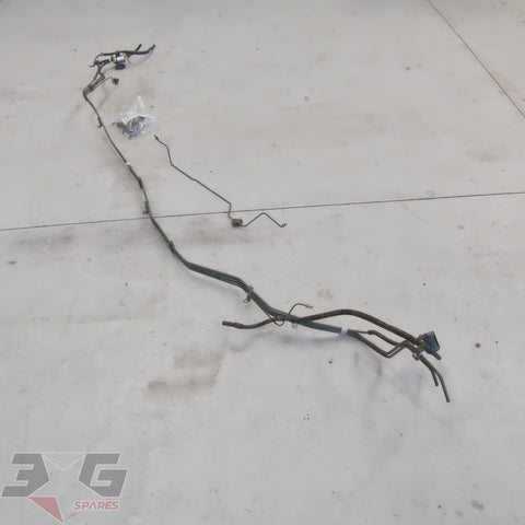 These are the complete set of lines which mount to the right frame rail under the car which includes;- High pressure fuel feed line, filter and mount.- Return line back to tank.- Fuel breather line to firewall.- Rear brake line from firewall junction to rear tee.- Rear brake line from left to right after tee connects straight to rear brake soft hoses.