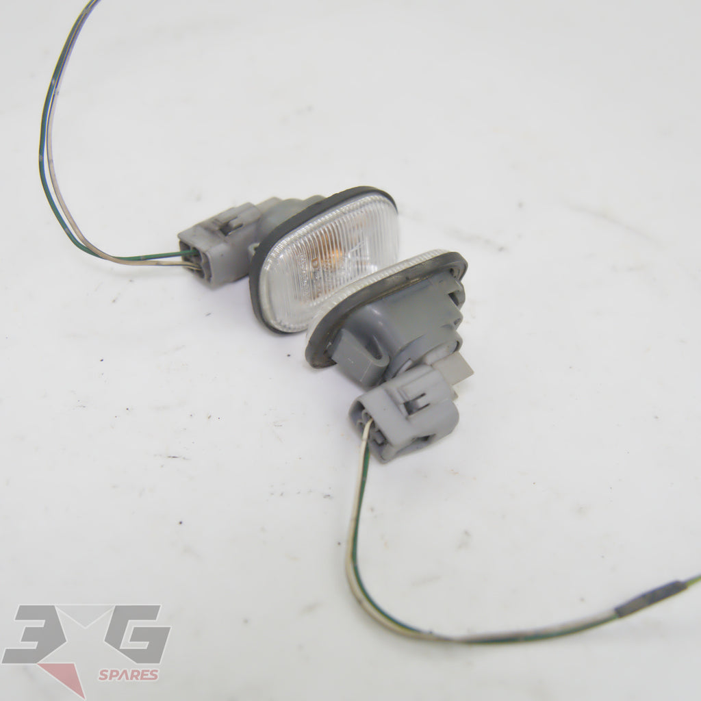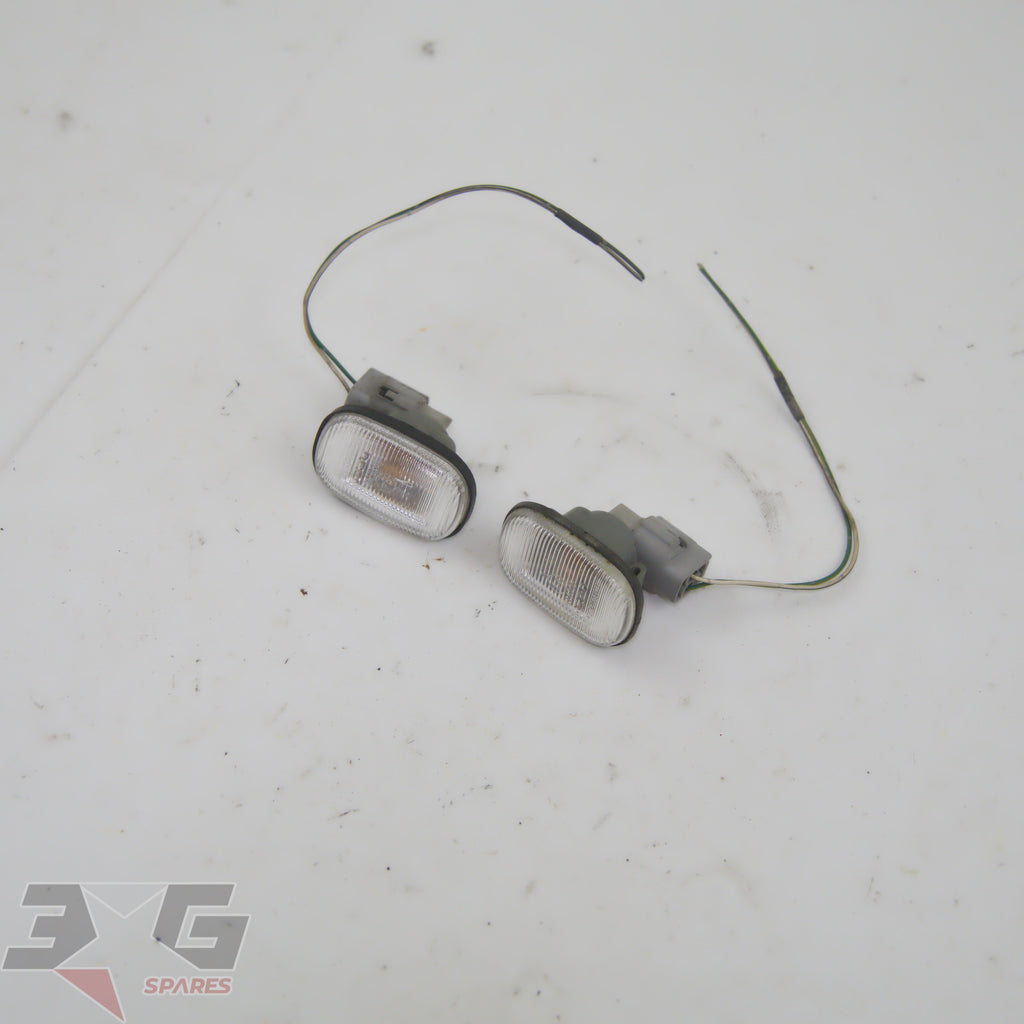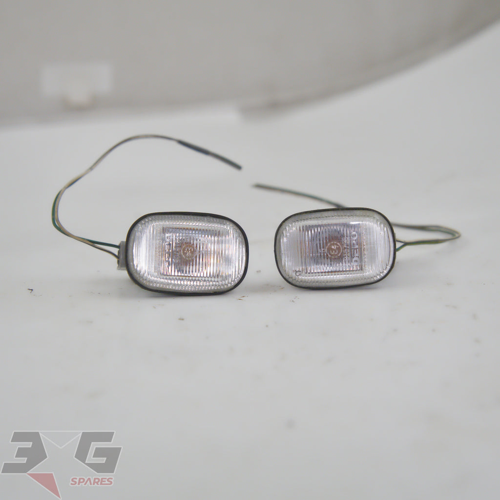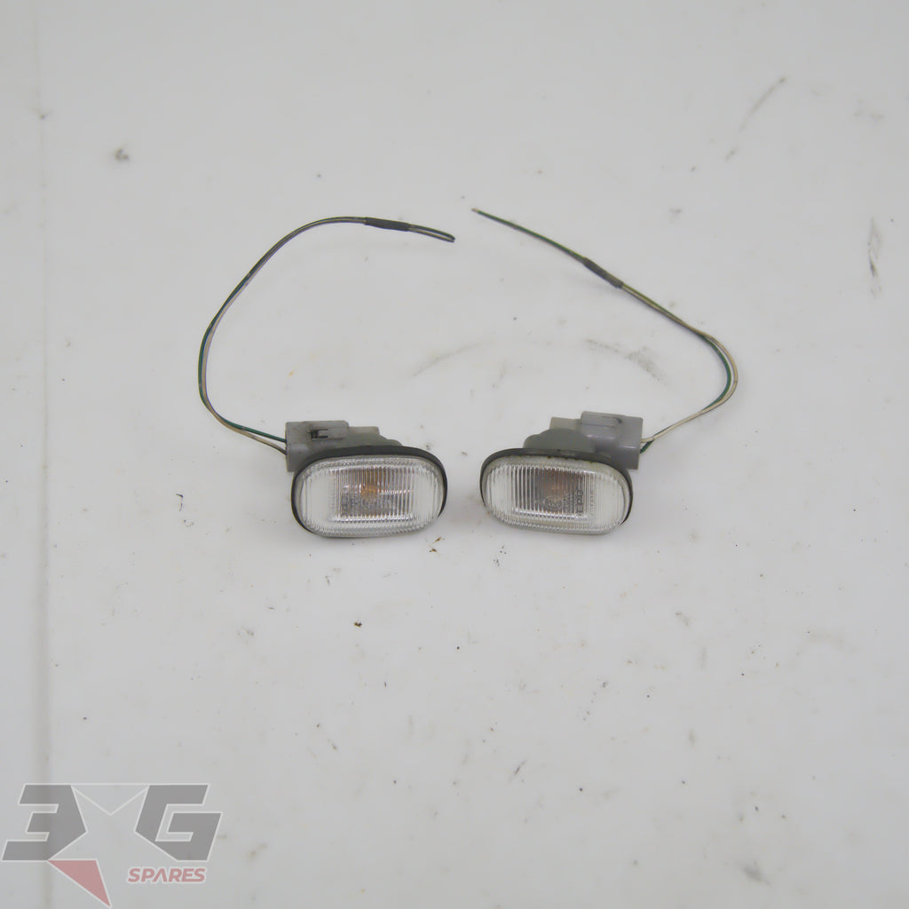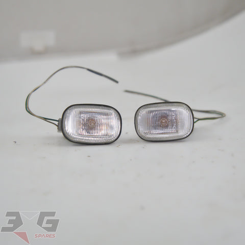 Aftermarket Depo branded left and right side clear lens side marker pair, as removed from an AE111 chassis Toyota Corolla Levin, years 1995 - 2000.