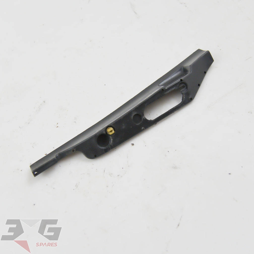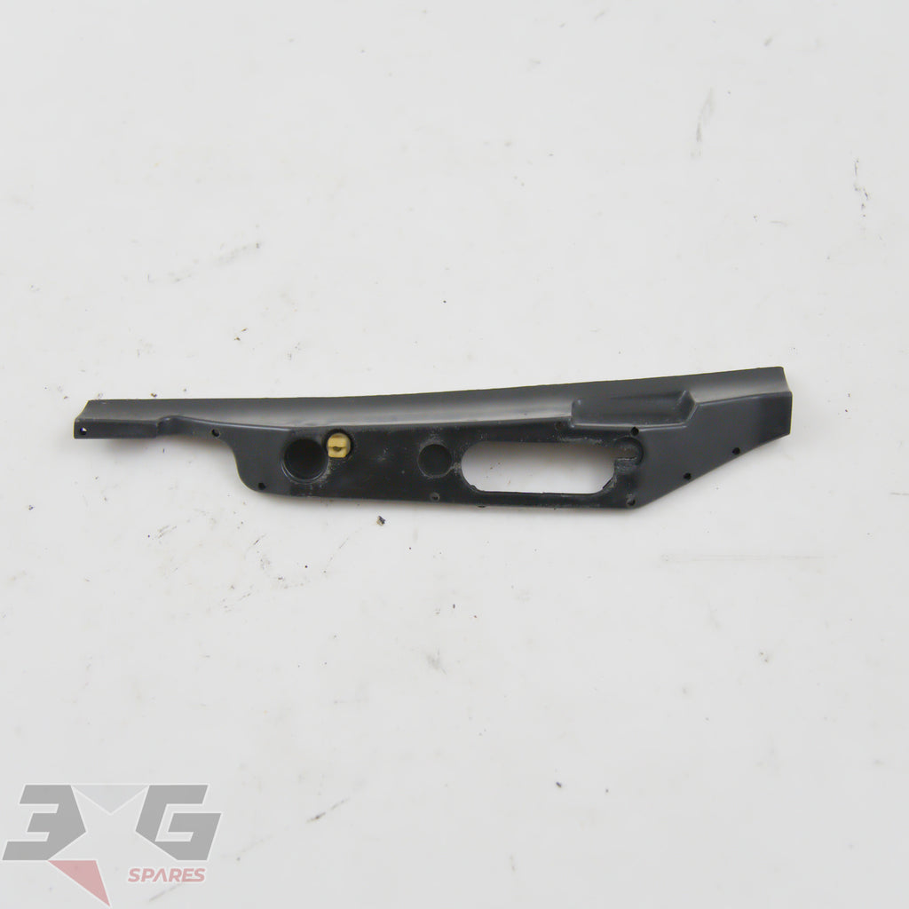This mounts on top of the headlight flip up mechanism on top of the core support, the hood rubber seal fits down onto it so it acts as a rain guard for the rear of the pop up headlight.