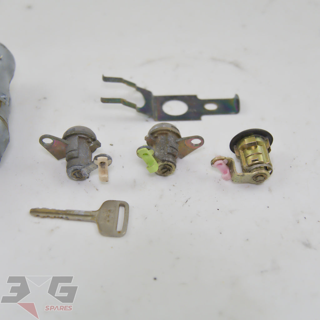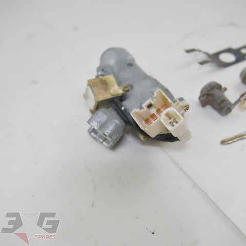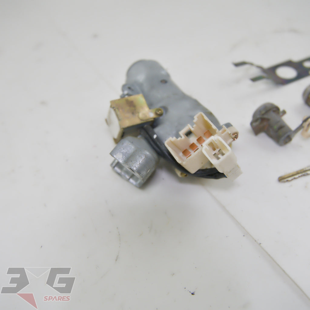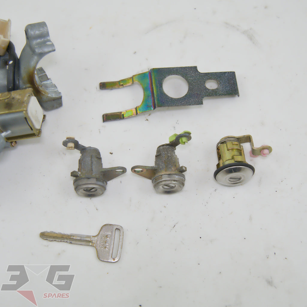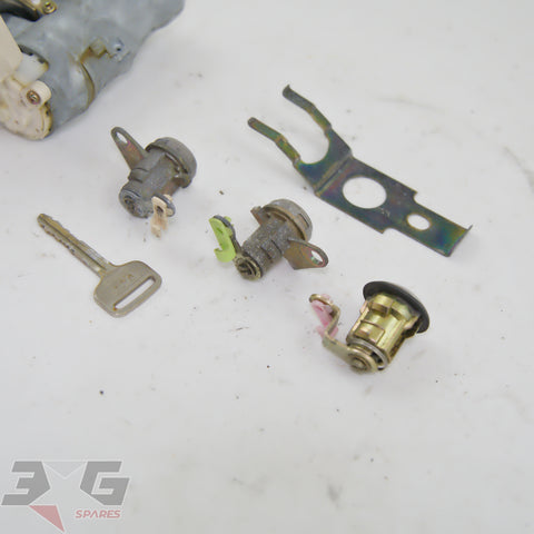 OEM factory lock set and steering column barrel casting, as removed from an AE111 chassis Toyota Corolla Levin, years 1995-2000.