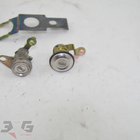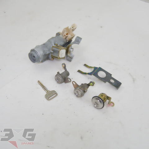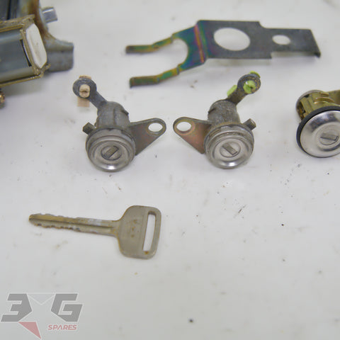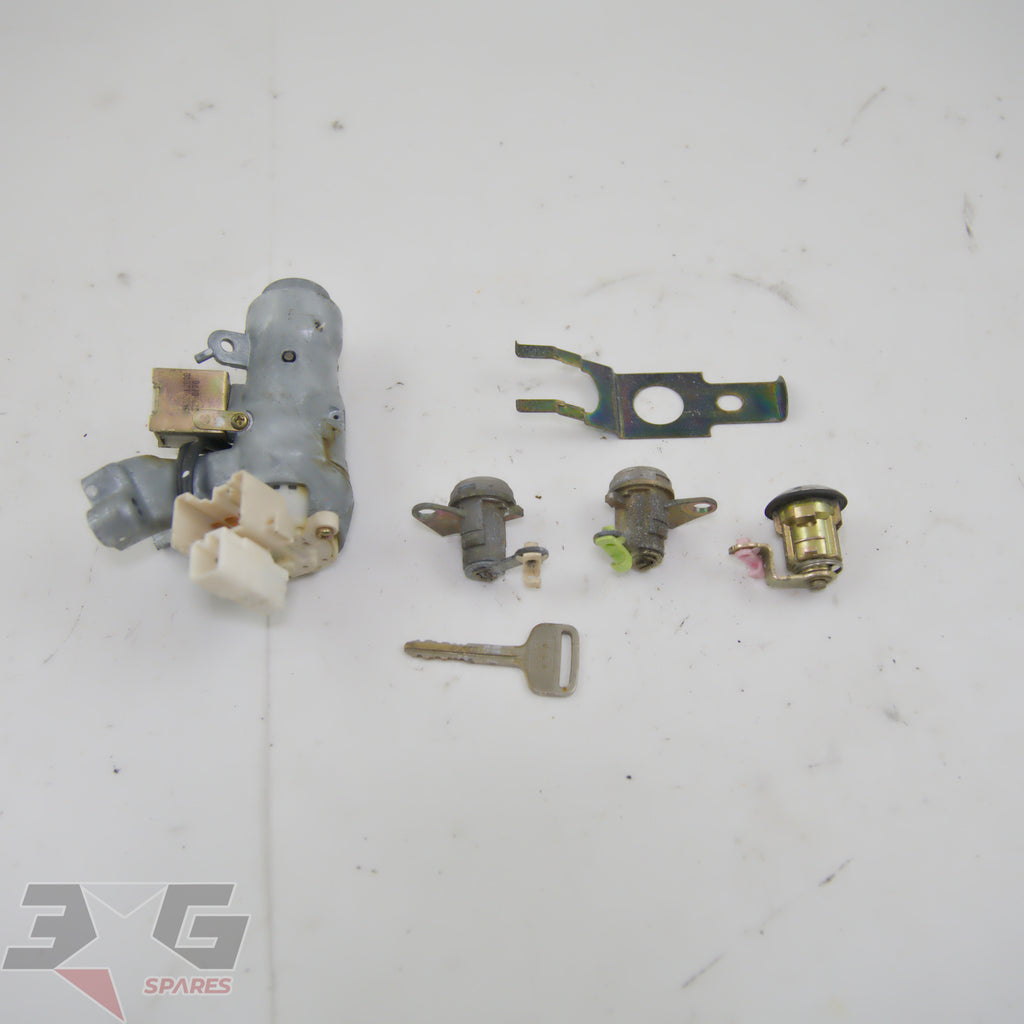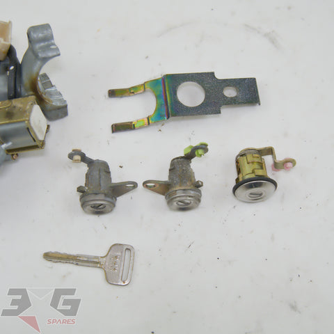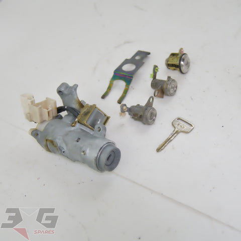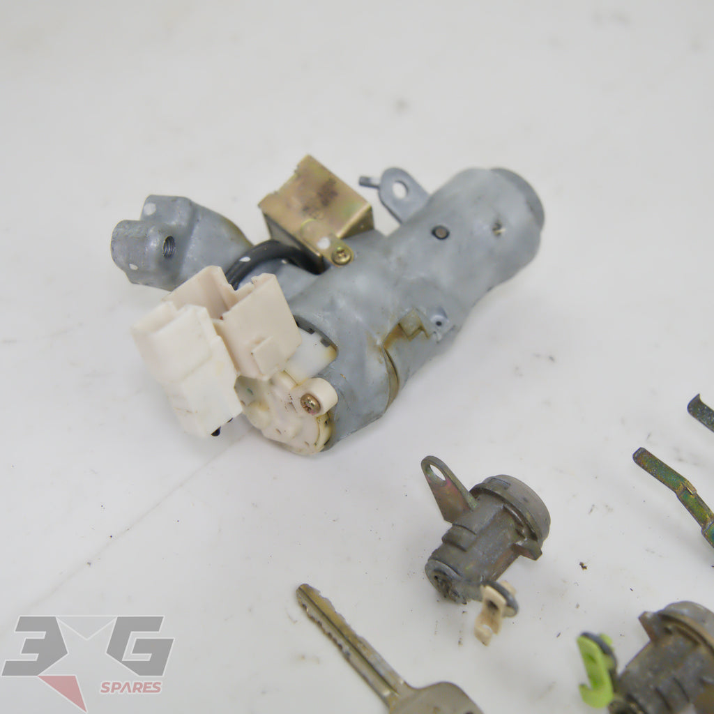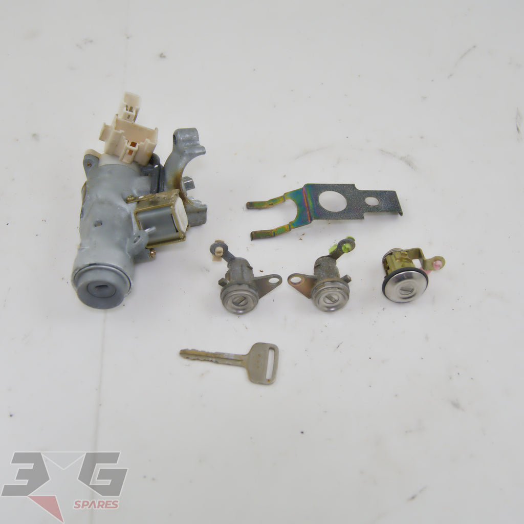 OEM factory lock set and steering column barrel casting, as removed from an AE111 chassis Toyota Corolla Levin, years 1995-2000.